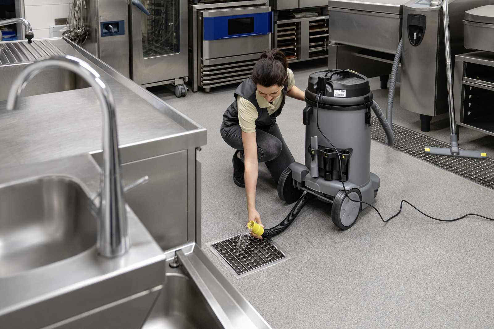 Le NT 48/1 possède un volume de cuve de 48 litres. L'appareil est équipé d'un crochet intégré pour le cordon d'alimentation sur la tête de la turbine, d'un rangement pour les tubes d'aspiration ainsi que d'un suceur pour sol et d'un suceur pour fentes sur la cuve. Le grand filtre à cartouche avec une surface filtrante de 0,8 m² garantit une puissance d'aspiration élevée constante de l'appareil. Le système à flotteur fiable garantit que le flux d'air est interrompu à temps, quel que soit le liquide aspiré. Grâce à la vaste surface de rangement sur le dessus de l'appareil, les outils ou autres accessoires peuvent toujours être posés à portée de main. Le NT 48/1 est en outre équipé d'un flexible d'évacuation ainsi que d'un châssis robuste avec de grandes roues fixes et des roulettes pivotantes. Un frein de stationnement et des poignées intégrées à la cuve permettent un transport facile.